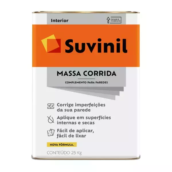 A Massa Corrida Lata 25Kg da Suvinil é um produto indicado para áreas internas e secas com o intuito de nivelar e corrigir a superfície, preparando a área para a pintura ou repintura.